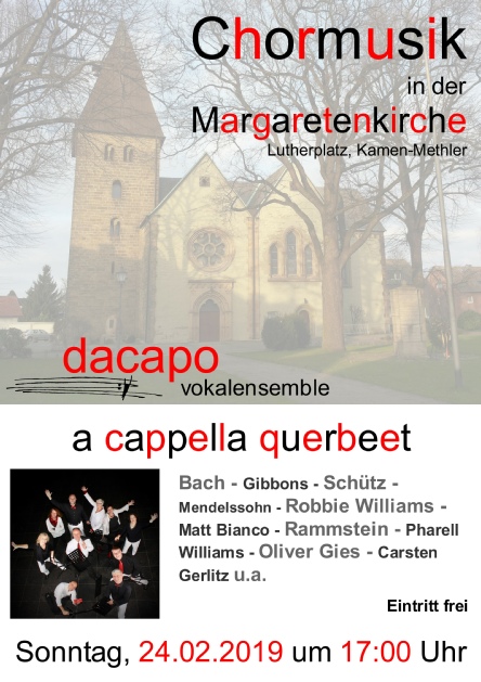 24.02.2019 - 17:00 Uhr: Konzert in der Margaretenkirche, Lutherplatz, Kamen- Methler (u.a. mit Werken von: Bach, Gibbons, Schütz, Mendelssohn, Robbie Williams, Matt Bianco, Rammstein, Pharell Williams, Oliver Gies, Carsten Gerlitz)